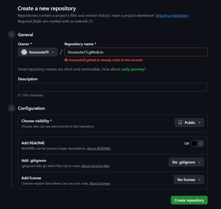 你的帳號.github.io,如itousouta15.github.io。